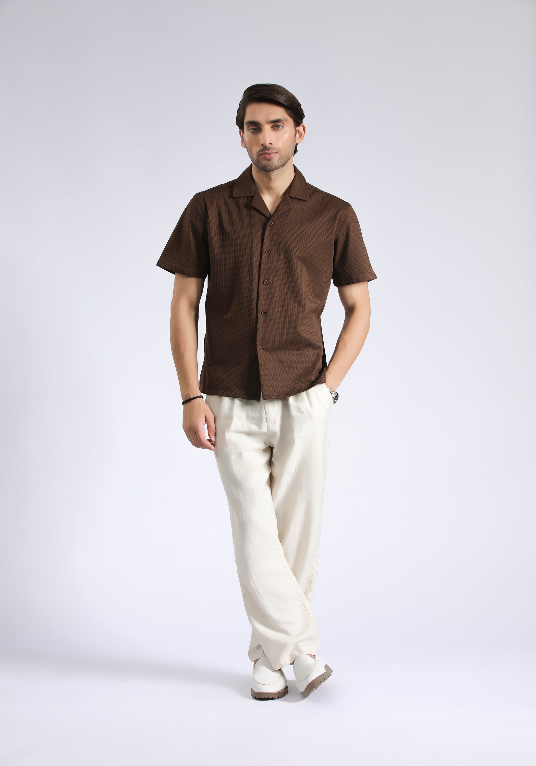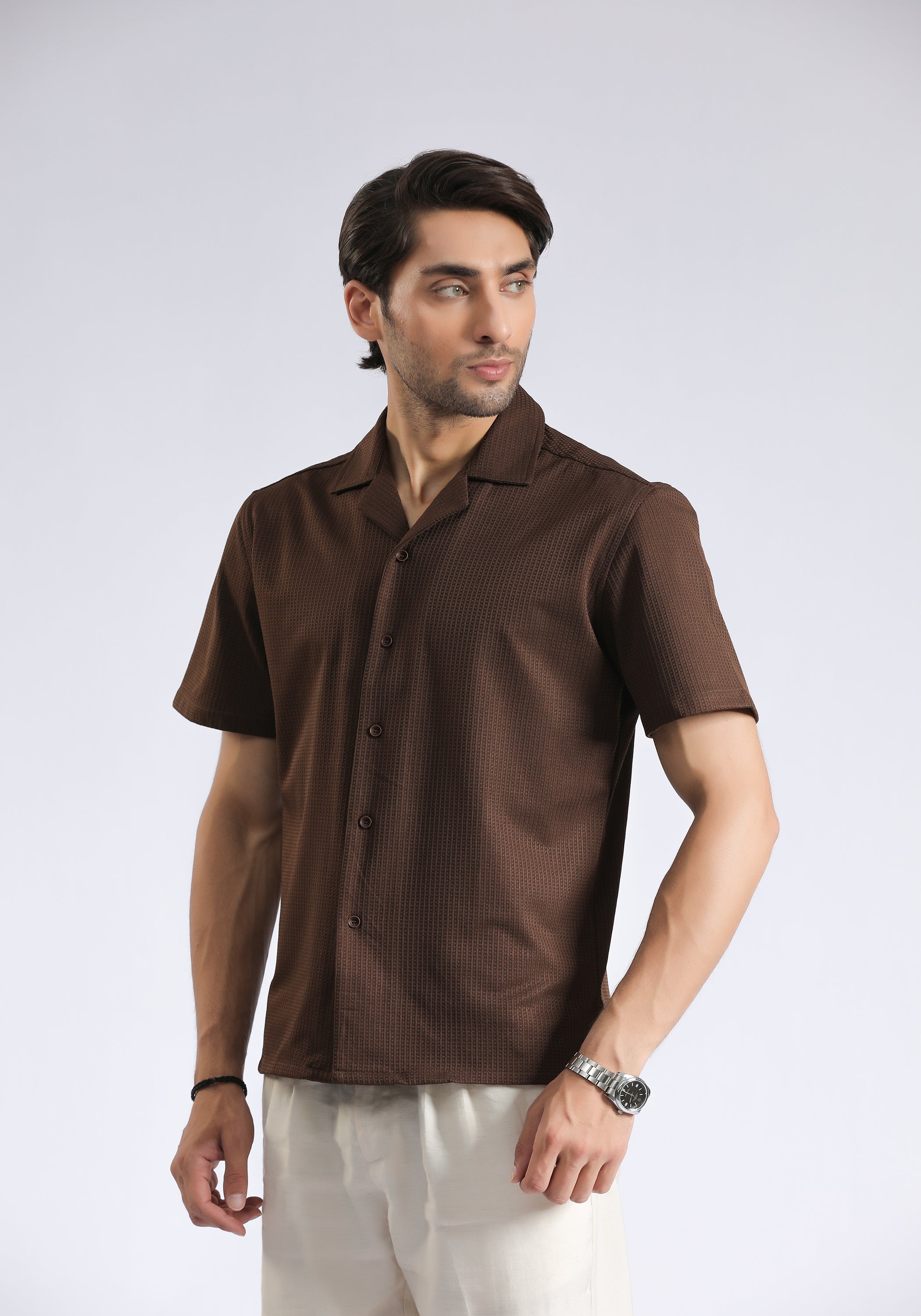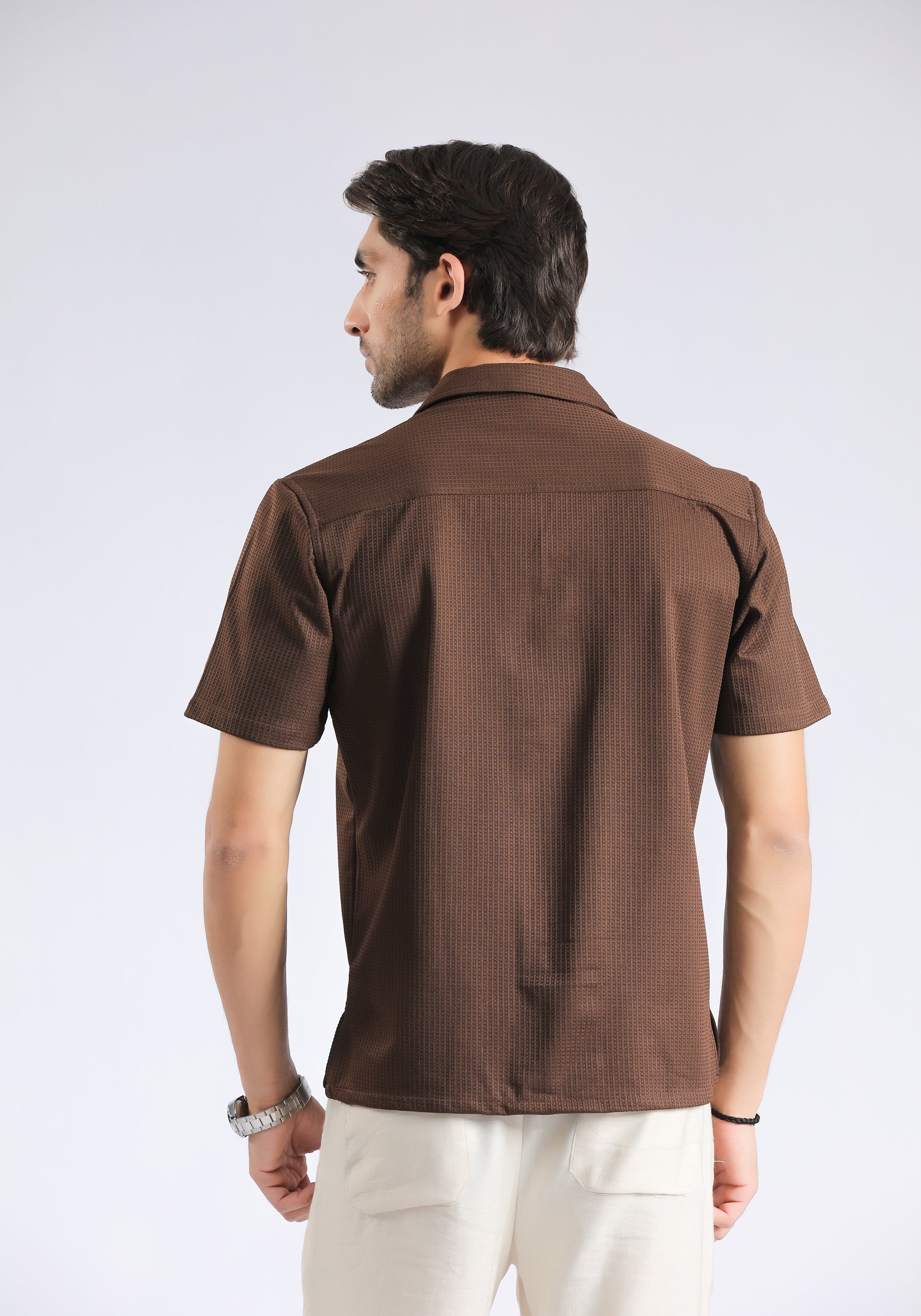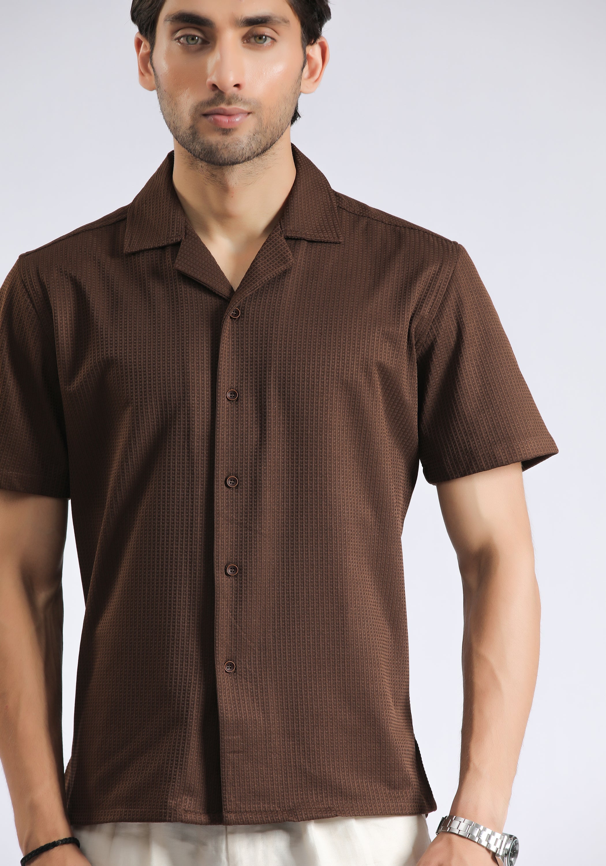 Indulge in a touch of Cuban charm with our Cuban Collar Brown Textured Shirt. Made from premium cotton, this shirt boasts a luxurious half sleeve design and a unique textured finish. Perfect for the sophisticated gentleman who wants to make a statement with his style.