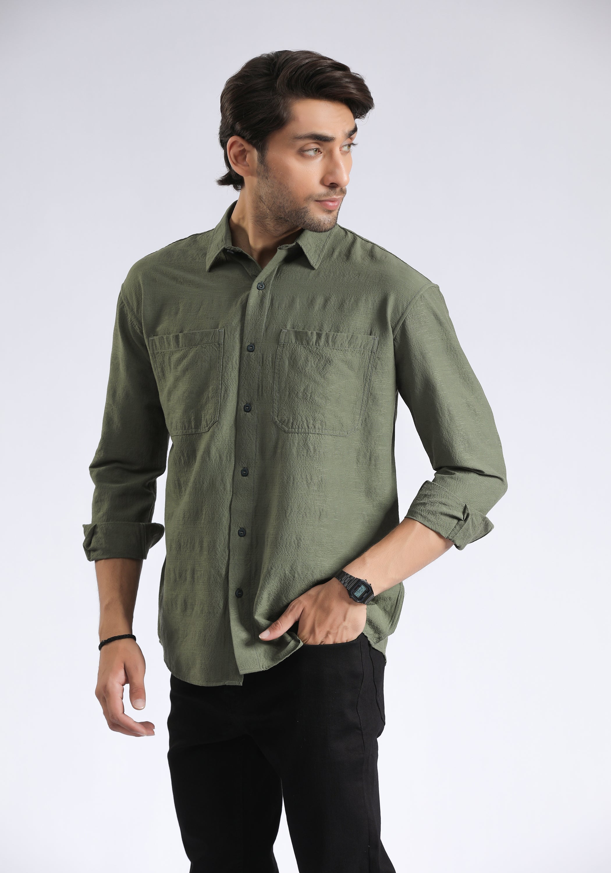 Experience the luxurious feel of our Olive Green Textured Shirt. Crafted from premium cotton, this full-sleeved shirt exudes sophistication and style. Elevate your wardrobe with this exclusive piece, perfect for any formal or casual occasion. Feel confident and elegant in our premium quality shirt.
